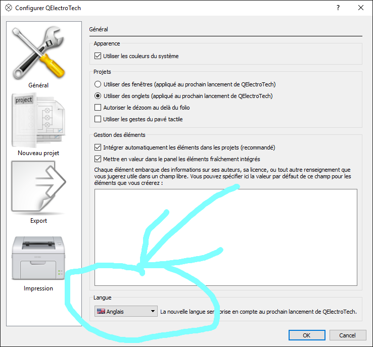 I changed the .bat file to: set command=bin\qelectrotech.exe --common-elements-dir=elements/ --common-tbt-dir=titleblocks/ -- LANG=en_EN --lang-dir=lang/ --config-dir=conf/ %* So I added the --lang=en_EN and now qelectrotech is in English just like I wanted. |