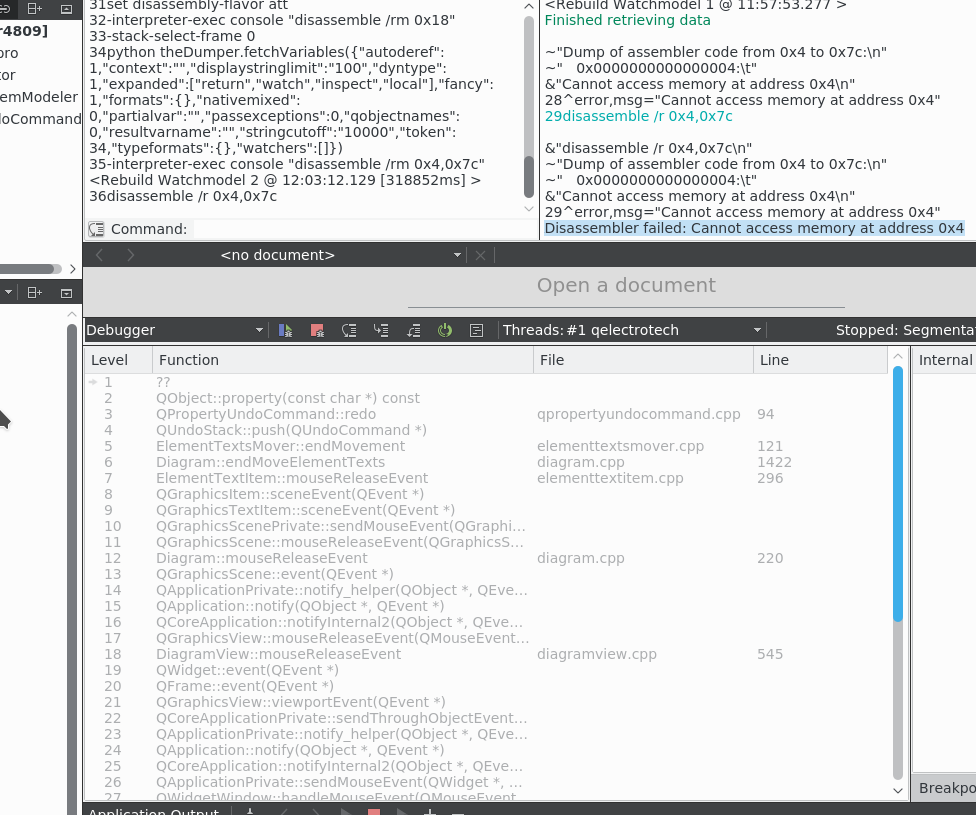 | Description | r4809 I had just begun making a shematic to learn terminal blocks. I placed some terminal blocks, and fuses, played with naming, moved some element and labels of then, suddenly segmentation fault. Additionally QtCreator fail to retrieve assembly, have not seen that before. Some problem in my system? | ||||