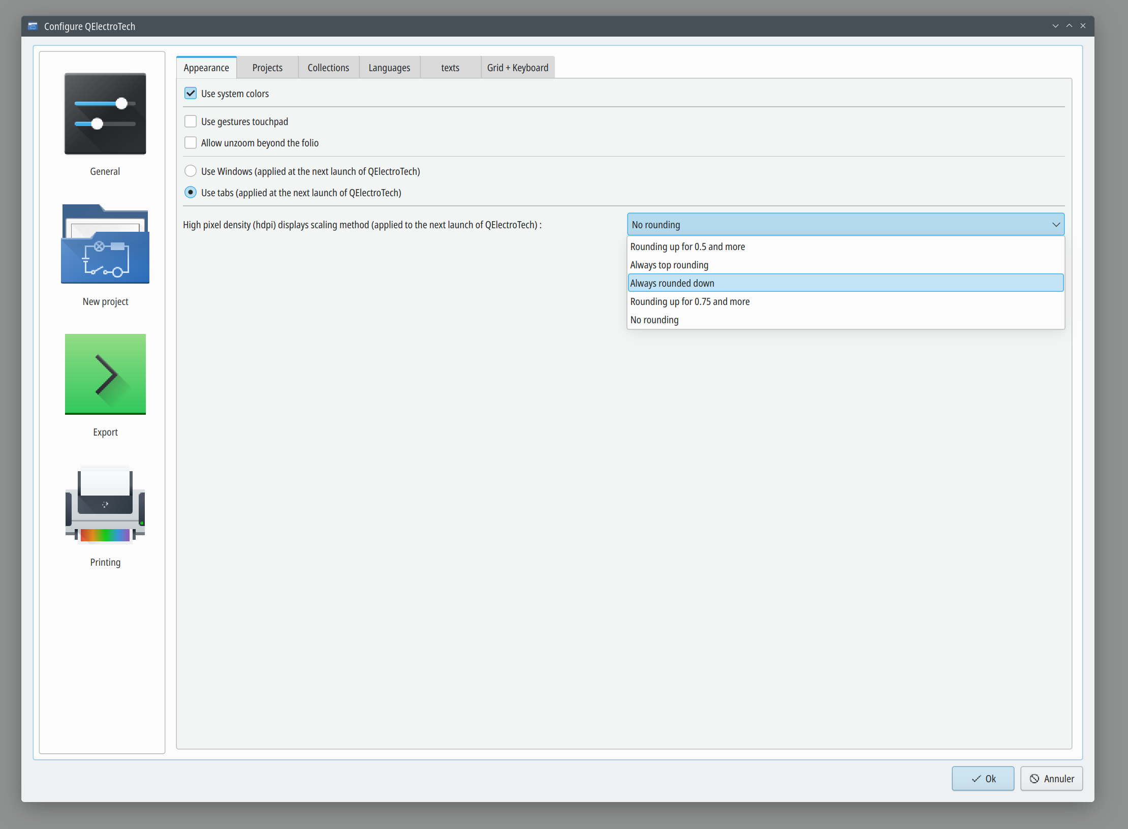 These settings do not seem to have any effect on the texts in UI widgets. I am not sure what they actually are supposed to do. Is this about the display in the drawing area? Correctly scaled are the main menu, the title bars on the panels and the tree views on the panels. Not scaled are the labels on tabs, toolbars and buttons, and the texts in input boxes, drop down boxes and so on. Icons and controls like check boxes are scaled correctly while their labels are not. Interestingly, when I start QET on a normal resolution screen and then move it to a high DPI screen all texts are scaled correctly, but, icons are not. And then, when I start QET on the high DPI screen set to 100 % scaling, and change the scaling factor to 200 % afterwards, everything seems to be as it should be. So this could be a workaround. |