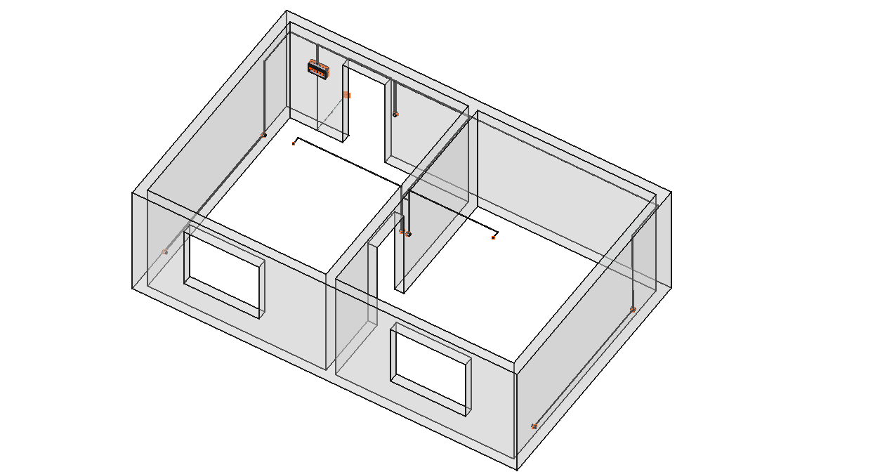5. Manually route base cable wires created in previous step on walls, ceillings etc. What helps in this step is that the starting and ending points of each cable are already attached to a specific element.