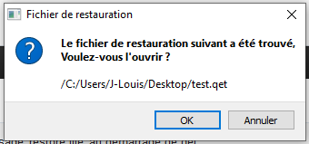 Lorsque j'ouvre 1 projet en passant par l'explorateur (double-clic sur le fichier .qet), qet s'ouvre, charge les collections et ensuite, il me dit qu'il a trouvé 1 fichier de restoration correspondant à mon projet. J'ai le message pour tous les projets que j'ouvre de cette manière.