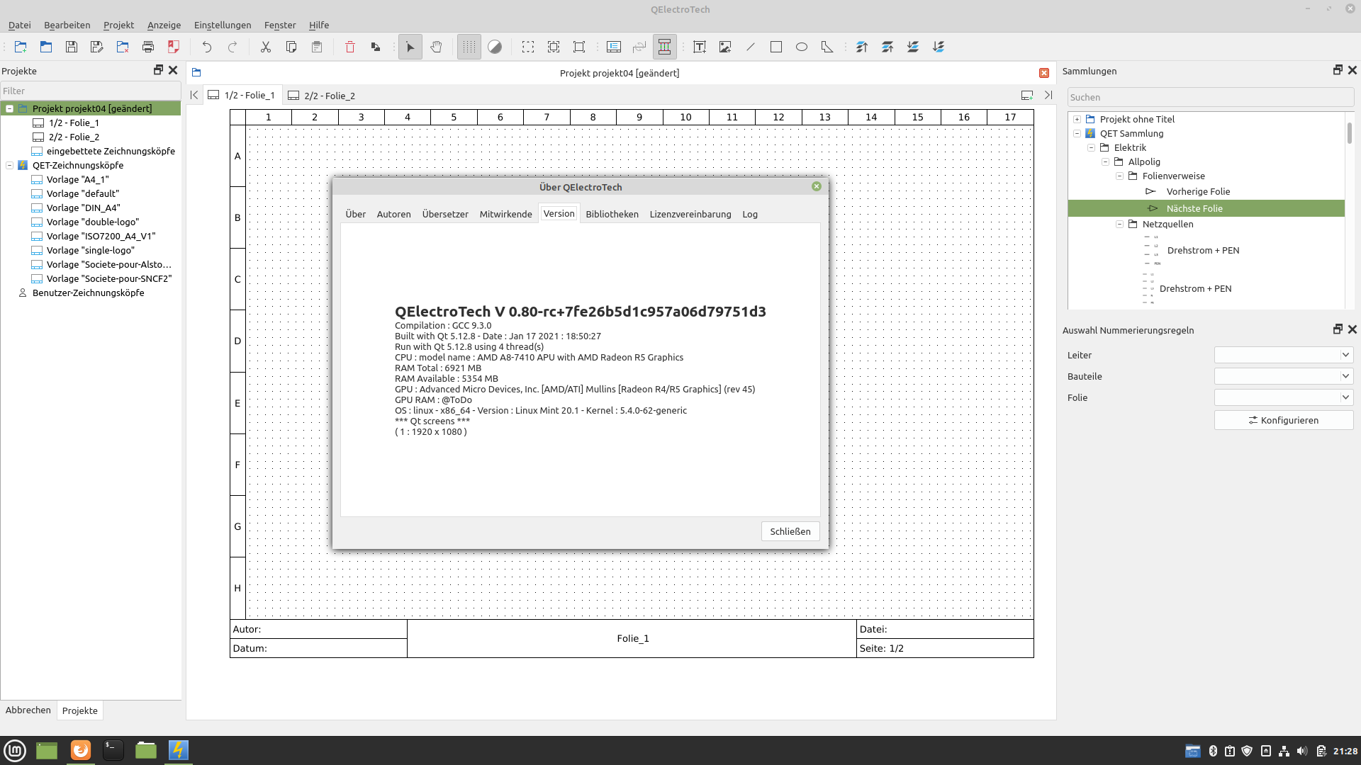 seit ca. einer Woche habe ein Problem mit den Folienverweisen. Nach Doppelklick auf das Bauteil Nächste/Vorherige Folie und "Bauteil verbinden" und "Anwenden" sind die Bauteile gebunden. Die automatischen Verweise in der Form: Foliennummer- Zeilennummer und Spaltennummer (%f-%l%c) fehlen aber. Die Folienverweise in den schon existierenden Projekten kann ich trennen und wieder Verbinden und die automatischen Verweise funktionieren. QElectroTech V 0.80-rc+7fe26b5d1c957a06d79751d3, Linux Mint 20.1. Vor einigen Tagen habe ich es mit Flatpak QElectroTech V 0.80-rc+7fe26b5d1 auf debian 10.7 versucht, mit dem gleichen Ergebnis.
