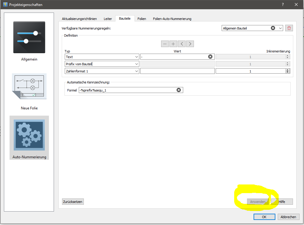 Ich wollte in den Projekteigenschaften bei den Bauteilen eine neue Nummerierungsregel anlegen. Soweit so gut, aber der Button "Anwenden" ist immer ausgeraut und so ist kein speichern möglich. Mache ich was falsch oder hat sich hier ein Bug eingeschlichen. Ich weiß das es in der vorherigen Version 0.6 noch funktionierte.