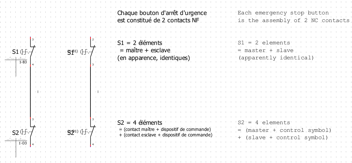 Supposons un bouton d'arrêt d'urgence (typiquement  “tourner pour déverrouiller”) avec 2 contacts NF.