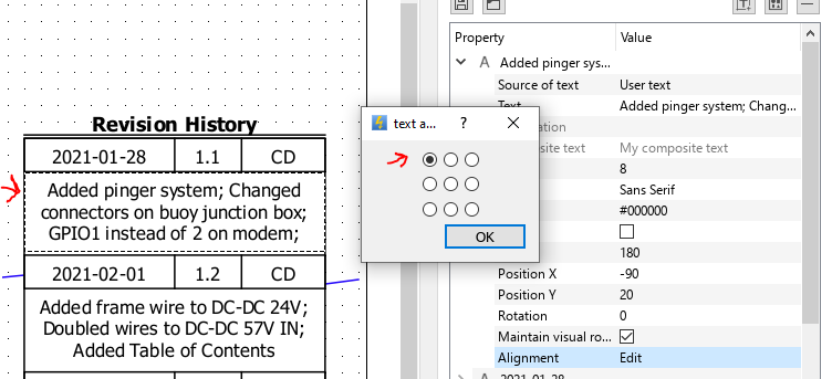 Moi aussi j'ai mis du temps à comprendre la propriété d'alignement du texte dans QElectroTech. Peut-être pourrait-on la renommer en "point d'ancrage" ou "point d'insertion" ? Mais ce n'est pas forcément plus clair...