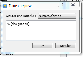 dans les variable des texte dynamiques composés, quand on sélectionne "Numéro d'article" la variable s'appelle "designation".