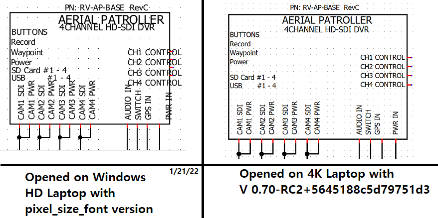 The text are automatically saved in html in the .qet file even if you don't use html formating. The html only write the pointSize of font and not the pixelSize, not impossible to do this, but probably not easy.