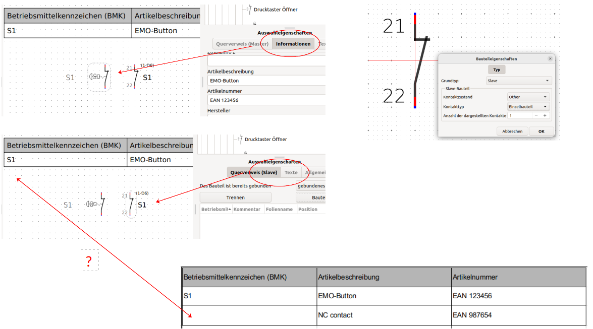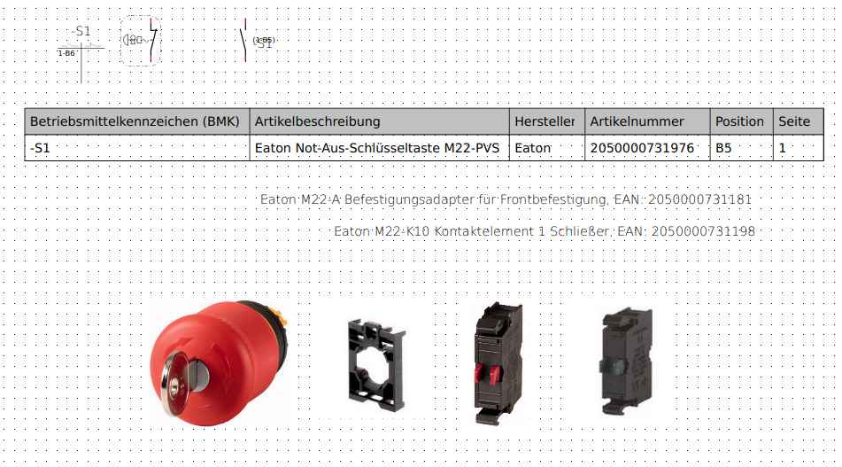 ich suche nach einer Möglichkeit, zusammengesetzte Betriebsmittel (z.B. Schütz mit Hilfsblock oder Schlüsseltaster mit Schliesser und Öffner) vollständig in der BMK-Liste aufzuführen. Das Bild im Anhang zeigt einen Schlüsseltaster, der mit 3 zusätzlichen Elementen bestückt werden kann.