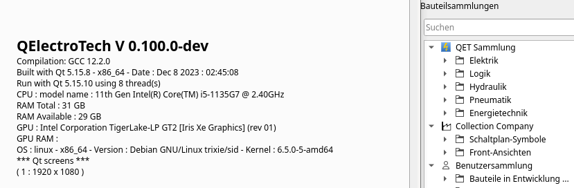 Der Wunsch nach einer zweiten Benutzer-Sammlung und Joshuas Bemerkung im Thread https://qelectrotech.org/forum/viewtopic.php?id=2105, dass die Implementierung gar nicht so schwer sein sollte, hat mich dazu veranlasst, eine virtuelle Debian-Maschine aufzusetzen und darauf alles zu installieren, was benötigt wird, um ein QT-Projekt zu erstellen bzw. zu übersetzen.