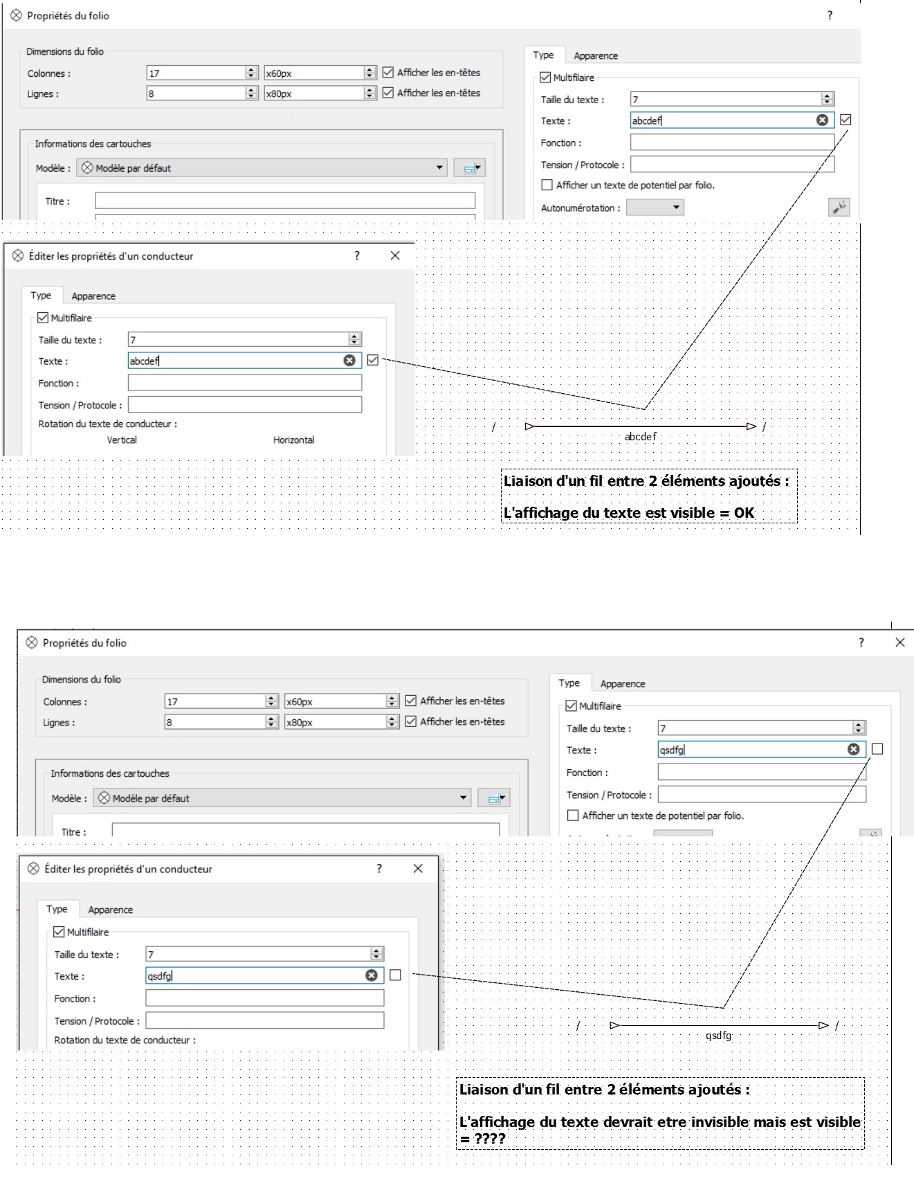 S'il y a du texte et que la case est décochée, chaque création de fil devient alors visible alors qu'il devrait etre invisible (la case étant décochée dans les propriétés du fil): cas n°2 dans l'image en dessous.
