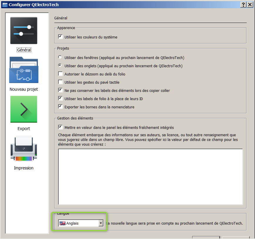 you need to quit and launch again QET to apply change.