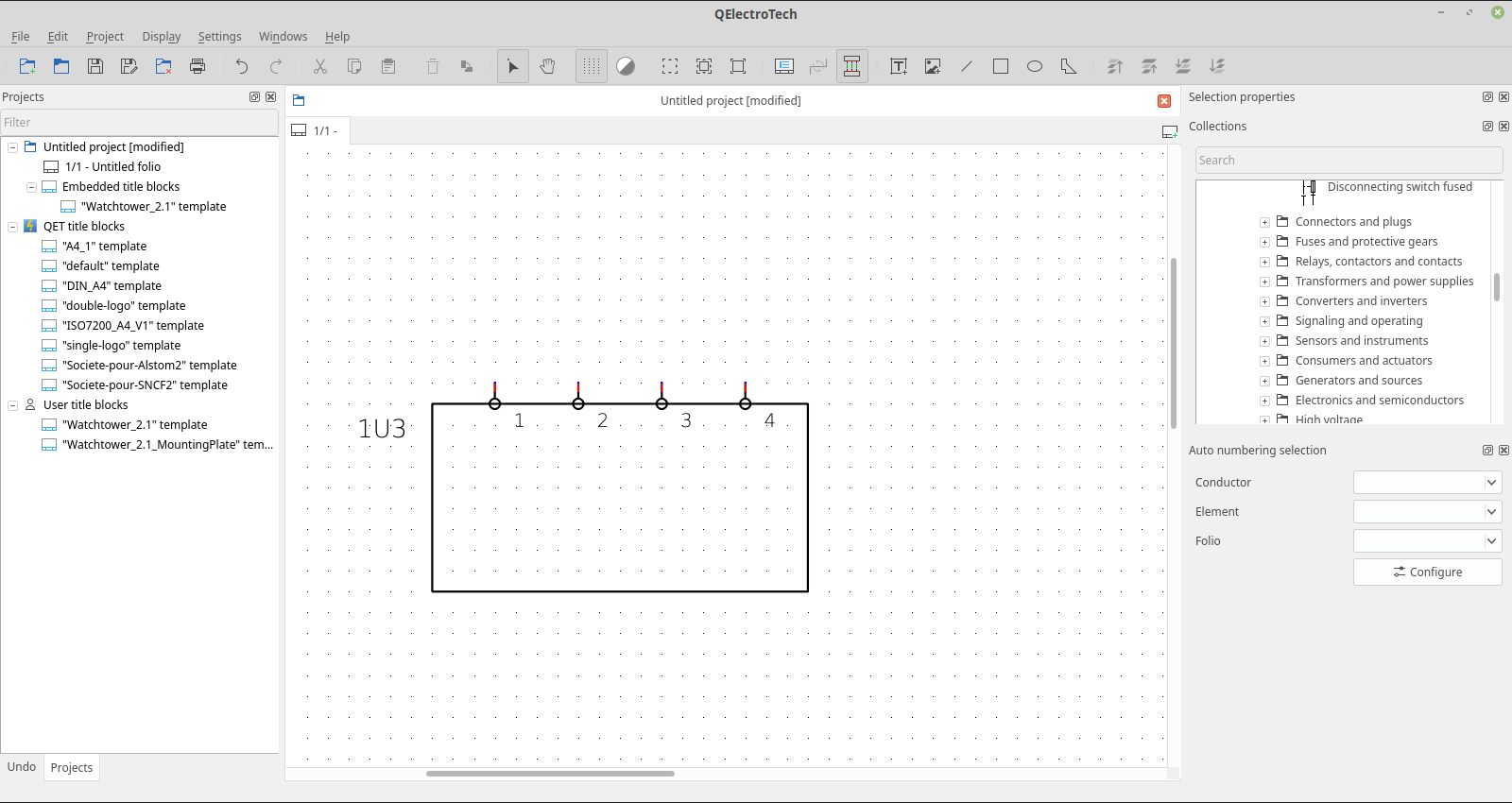 As shown in the attached screenshot, the element-box (1U3) has 4 separate terminals placed on (or possibly within) the rectangle. These will inherit the 1U3 code. They have a junction-connection with the numbers 1 to 4. Location and installation fields are empty in this example, so they will automatically be the same as the standard location and installation of the whole page.